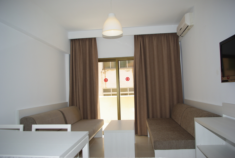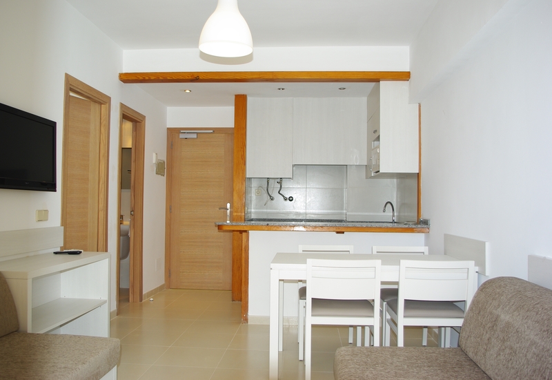 Un apartamento sin vista al mar (o estándar) consta de un salón-comedor con cocina en barra americana totalmente equipada, un dormitorio doble con dos camas individuales y un baño completo. Además gran parte de nuestros apartamentos sin vista al mar disponen de balcón hacia el patio interior.
